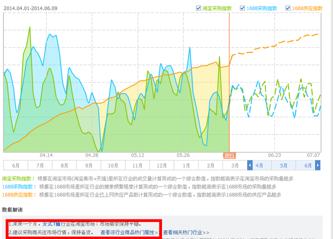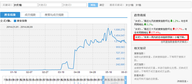 現(xiàn)階段,比如我準(zhǔn)備推女式t恤,那么就需要我們先看看大盤是個(gè)什么情況,選擇還在熱銷中的寶貝去推,不能盲目投放。這個(gè)簡單,通過兩方面來看:淘寶指數(shù)和阿里指數(shù)  通過這些數(shù)據(jù)來看,整體行情還是可以的,市場行情基本處于平穩(wěn)的狀態(tài),還處于可推廣得范圍。