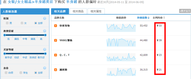 ③通過淘寶搜索頁面的銷量排名去看,現(xiàn)階段寶貝銷量最多的價(jià)位如何。 ?、芩阉仨撁嬷袃r(jià)格區(qū)間的顯示,這個(gè)太精準(zhǔn),顯示的范圍相對來說比較大,基本上包含的是淘寶和天貓主要的成交區(qū)間。一般淘寶的成交價(jià)格相對低一些,而天貓相對的品牌性,客單相對過高。  通過這幾步的分析寶貝的定價(jià),基本不是問題了。如果寶貝自身的品質(zhì)就相對高端,那你就走高端路線。我的意思,大眾需要什么,你給他什么。產(chǎn)品定價(jià)不是一味低價(jià)或者一味暴利,這種極端的做法不可取。一定要根據(jù)自身類目的市場情況來定價(jià),在保證利潤的前提下盡量貼近市場價(jià)格,我們的營業(yè)額在于產(chǎn)品的受眾群體,所以要去迎合不是所有人,至少是大部分人。