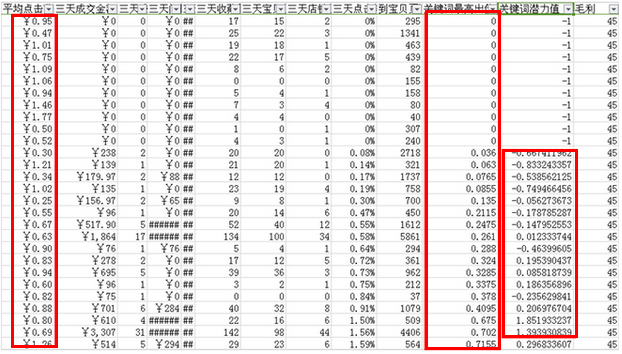 通過量子后臺下載關(guān)鍵詞報(bào)表:  使用公式:PPC高出價(jià)=轉(zhuǎn)化率單品毛利潤;關(guān)鍵詞潛力值=(產(chǎn)出-花費(fèi))/花費(fèi);進(jìn)行篩選,潛力值高的,重點(diǎn)優(yōu)化,高于最高點(diǎn)擊單價(jià)的關(guān)鍵詞,重點(diǎn)降低PPC。  將最高出價(jià)降序排列,遠(yuǎn)遠(yuǎn)低于平均點(diǎn)擊出價(jià)的關(guān)鍵詞,很難實(shí)現(xiàn)優(yōu)化效果的關(guān)鍵詞,可以果斷刪除。  對于已經(jīng)優(yōu)化到瓶頸的關(guān)鍵詞,我們可以刪除,保留在EXCEL里面,然后重新建立一個(gè)計(jì)劃,區(qū)域時(shí)段,都和老計(jì)劃一樣,將這些詞重新優(yōu)化起來,這樣關(guān)鍵詞的PPC就反向的降低下來了。  PPC最高出價(jià)=2.23%45=1.035>實(shí)際PPC:0.88
