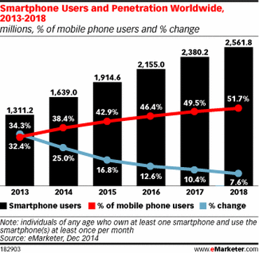 根據(jù)eMarketer的最新研究報告,全球智能機保有量將持續(xù)攀升。今年全世界手機中有38%是智能機,而到了2018年,這一數(shù)字將突破50%。此外,到2016年的時候,全球智能機數(shù)量將達到21.6億臺,而這也將是其跨越20億關(guān)卡的這一年。相比之下,去年全球智能機數(shù)量只有13億,今年也只會增長到16億。