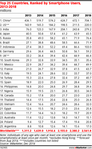 相比之下,美國當前僅有1.653億智能機用戶(排名第二),而印度(排名第三)2013年的智能機用戶也只有7600萬(但是會在2018年增長到2.792億)。