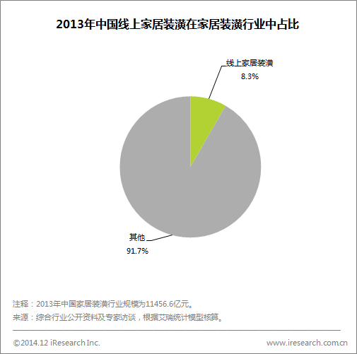 雖然過去幾年增長速度較快,線上家居裝潢市場在行業(yè)中的整體占比仍然不高,根據(jù)艾瑞咨詢統(tǒng)計,2013年我國線上家居裝潢行業(yè)交易額規(guī)模在955.1億元,占行業(yè)整體規(guī)模比例為8.3%。