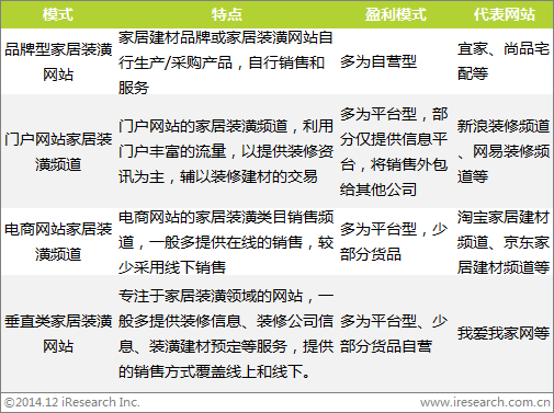 線上家居裝潢行業(yè)的網(wǎng)站類別可以分為四類,分別是垂直類家居裝潢網(wǎng)站、門戶網(wǎng)站家居裝修頻道、電商網(wǎng)站家居裝修頻道和品牌型家居裝潢網(wǎng)站。