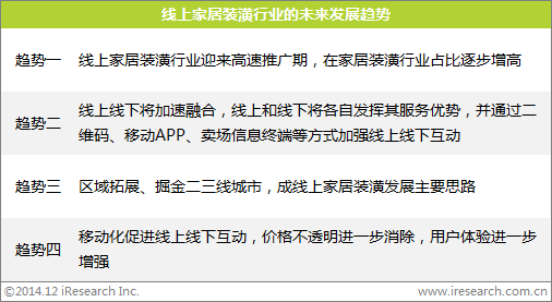 2011年以來,線上家居裝潢市場進入高速推廣期,各家居裝潢網(wǎng)站發(fā)現(xiàn)線下體驗中心的優(yōu)勢后,紛紛拓展建立家居體驗中心,力圖從體驗上搶占先機。同時,領先的線上家居裝潢企業(yè)正利用其在一線城市先進的技術和家居體驗中心運營理念,向二三線城市拓展。此外,線上家居裝潢還不斷通過先進的移動互聯(lián)網(wǎng)、二維碼等技術,打通O2O瓶頸,進一步提高用戶體驗。而在這一階段,資本力量也開始介入這一市場,2014年3月,我愛我家網(wǎng)進行資本運作,上市公司寶鷹股份宣布出資1.08億、占比20%的股權(quán)入股我愛我家網(wǎng)。在資本的推動下,行業(yè)發(fā)展必將進入一個更快的階段。