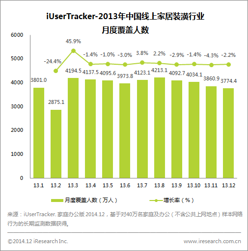 根據(jù)艾瑞iUserTracker數(shù)據(jù),2013年中國線上家居裝潢行業(yè)的月度覆蓋人數(shù)平均為3931.3萬人,總體波動不大,其中2月份為低谷,可能與春節(jié)期間裝修活動停滯有關。