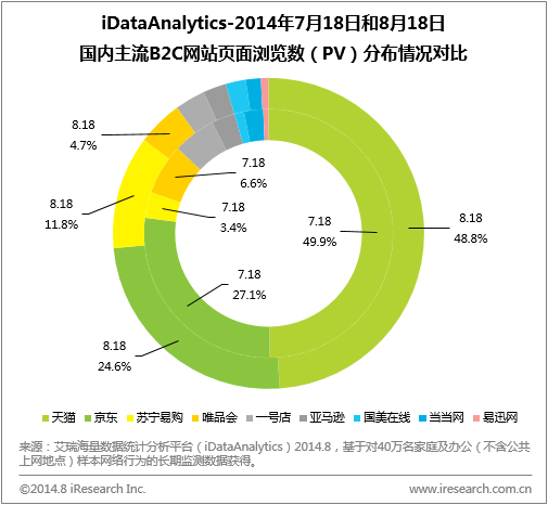 比較7月18日和8月18日兩天網(wǎng)購(gòu)用戶在主流B2C平臺(tái)上的頁(yè)面瀏覽分布,可以明顯地看到促銷(xiāo)活動(dòng)對(duì)電商站點(diǎn)間流量的流動(dòng)影響:7月,一號(hào)店借店慶促銷(xiāo)流量大漲,7月18日在選定的電商網(wǎng)站中PV占比達(dá)5.6%,是8月18日的1.8倍;到了8月,蘇寧易購(gòu)的“省到?jīng)]話說(shuō)”主題促銷(xiāo)也在流量份額中為自己多爭(zhēng)了一席:8月18日PV份額為11.8%,同比7月18日增幅高達(dá)248.8%。