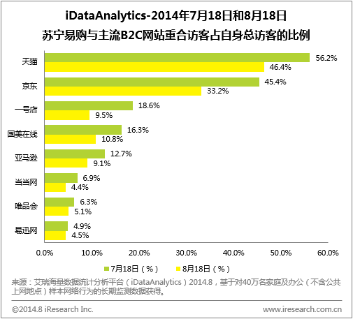 8月18日,蘇寧易購(gòu)PV占比大幅增加的同時(shí),其獨(dú)占訪客也有明顯提升,占總訪客的27.5%,同比增長(zhǎng)78.6%。而與選定站點(diǎn)的重合訪客比例則無(wú)一例外的均有所下降,其中以與天貓、京東、一號(hào)店的重合變化最為明顯:蘇寧易購(gòu)的訪客中,訪問(wèn)天貓和京東的訪客占比8月18日比7月同期均下降了約10個(gè)百分點(diǎn);與一號(hào)店的重合比例則減少近半。