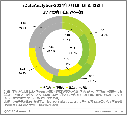 電商用戶在下單前,選定待購(gòu)商品的訪問(wèn)路徑主要有三種類(lèi)型:一是有較明確的使用需求,通過(guò)搜索來(lái)尋找目標(biāo)商品;另一種是受推廣吸引,點(diǎn)擊首頁(yè)焦點(diǎn)輪播等促銷(xiāo)廣告或進(jìn)入專題促銷(xiāo)頁(yè)而后迸發(fā)對(duì)某商品的購(gòu)買(mǎi)意向;還有一種,是從導(dǎo)航和面包屑等位置進(jìn)入商品列表頁(yè)再選擇商品下單。當(dāng)然,同一個(gè)下單訪客在選擇商品過(guò)程中,可能兼顧了幾種訪問(wèn)路徑,此時(shí),則取最接近下單頁(yè)的頁(yè)面類(lèi)型為下單頁(yè)的來(lái)源。比較7月18日和8月18日蘇寧易購(gòu)的下單訪客來(lái)源,可以看到:8月18日通過(guò)搜索下單的訪客為20.5%,同比提升27.3%;而列表頁(yè)為下單頁(yè)帶來(lái)的訪客占下單總訪客的比例穩(wěn)定在兩成左右。對(duì)于活動(dòng)頁(yè)來(lái)說(shuō),借助于百度品牌專區(qū)推廣、軟文等媒體宣傳以及“閃拍”、“大聚會(huì)”等營(yíng)銷(xiāo)產(chǎn)品的推出,8月18日蘇寧易購(gòu)的活動(dòng)頁(yè)流量占比大漲,整站2/3的訪客會(huì)訪問(wèn)活動(dòng)頁(yè),而7月18日不足30%;相應(yīng)的,8月18日通過(guò)活動(dòng)頁(yè)下單的蘇寧訪客占比上升到33.0%,同比增幅118.5%。