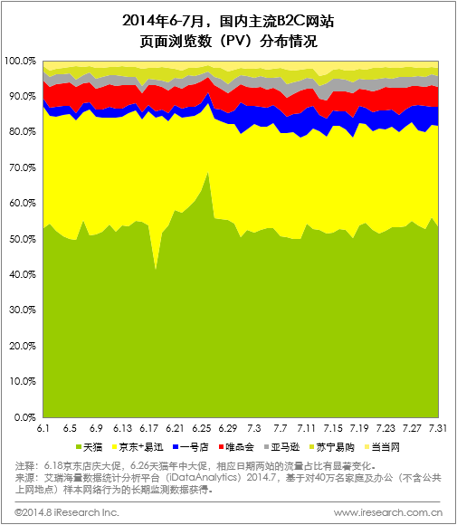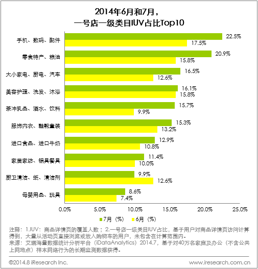 繼京東6·18引發(fā)了一輪電商大促之后,一號(hào)店六周年店慶促銷(xiāo)又狂歡了整個(gè)7月。艾瑞咨詢(xún)iResearch基于網(wǎng)民連續(xù)用戶(hù)行為研究系統(tǒng)(iUserTracker)推出的海量數(shù)據(jù)分析服務(wù)iDataAnalytics-電商版,經(jīng)過(guò)深度挖掘數(shù)據(jù)顯示:一號(hào)店7月大促完美收官,促銷(xiāo)期間在B2C市場(chǎng)中的占有率大幅提升,電器和食品類(lèi)商品的訪問(wèn)占比明顯升高。