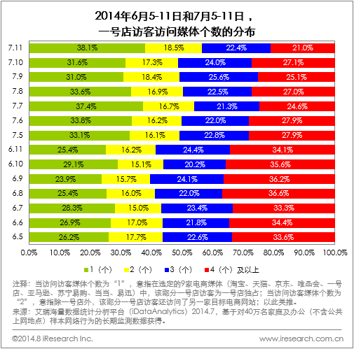 一號(hào)店7月大促期間,獨(dú)占訪客比例有明顯提升。以6月5-11日和7月5-11日這兩周數(shù)據(jù)為例:6月5-11日期間,一號(hào)店獨(dú)占訪客平均占其總訪客的26.4%,而7月5-11日均值為34.1%,同比增長(zhǎng)29.2%;同時(shí),訪問(wèn)4個(gè)及以上電商網(wǎng)站的用戶(hù)則從34.8%銳減至25.8%。艾瑞分析認(rèn)為,一號(hào)店大促期間,得力于 “免費(fèi)領(lǐng)”、“充值送抽獎(jiǎng)”、“吉尼斯破紀(jì)錄”等折扣模式以及地鐵廣告等宣傳渠道,相當(dāng)一部分網(wǎng)購(gòu)用戶(hù)減少了在電商站點(diǎn)間的比價(jià)和商品選擇上的猶疑,受媒體宣傳和價(jià)格驅(qū)動(dòng)的影響選擇了一號(hào)店。