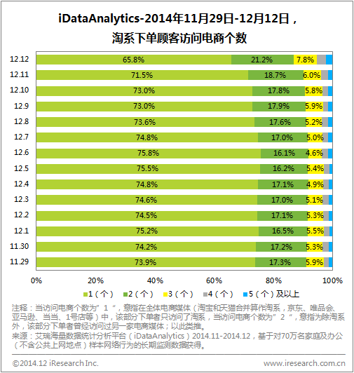 “雙十一”阿里571億的消費高峰之后,緊隨而來的“雙十二”各大電商又表現(xiàn)如何?在如此密集的促銷活動中,用戶的購買習(xí)慣是否有規(guī)律可循?艾瑞咨詢iResearch基于網(wǎng)民連續(xù)用戶行為推出的海量數(shù)據(jù)分析服務(wù)iDataAnalytics-電商版,經(jīng)過深度挖掘數(shù)據(jù)顯示:“雙十二”淘寶、天貓、京東頁面瀏覽數(shù)穩(wěn)居前三,阿里的獨占用戶優(yōu)勢明顯,同時促銷當(dāng)日的0-1點、10-11點和23點以后是淘寶和天貓用戶下單率高峰時段。