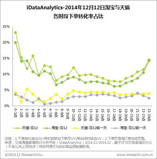 而從各時段來看淘寶和天貓的下單情況,可以看出其走勢相近。0-1段大促日伊始,兩站下單轉(zhuǎn)化率達(dá)到最高峰,同時在上午的10-11點又是一個網(wǎng)購小高潮。對比大促日前一天,可以明顯看到促銷日的首、尾時段網(wǎng)購行為的爆發(fā)。
