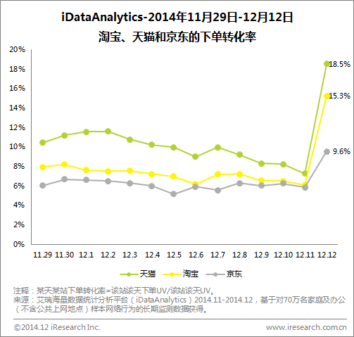 流量先行是根本,轉(zhuǎn)化跟上更重要。從近兩周的下單轉(zhuǎn)化率可以看到,三大電商不只留下了顧客的身影,更是留下了顧客的錢包,“12.12”淘寶、天貓和京東三站的轉(zhuǎn)化率均達(dá)到了巔峰:其中,天貓的下單轉(zhuǎn)化率拔得頭籌,高達(dá)18.5%,幾乎是平時的兩倍,淘寶和京東也分別增長到了15.3%和9.6%,增幅明顯。同時可以看到天貓和淘寶在11日轉(zhuǎn)化率降至低點,不難想見,淘寶、天貓大促日當(dāng)天的轉(zhuǎn)化率劇增,和其提前造勢、用戶需求累積的關(guān)系顯著。然而,京東在大促日轉(zhuǎn)化率升高的同時,前一天卻沒有明顯下降趨勢,很是可貴。