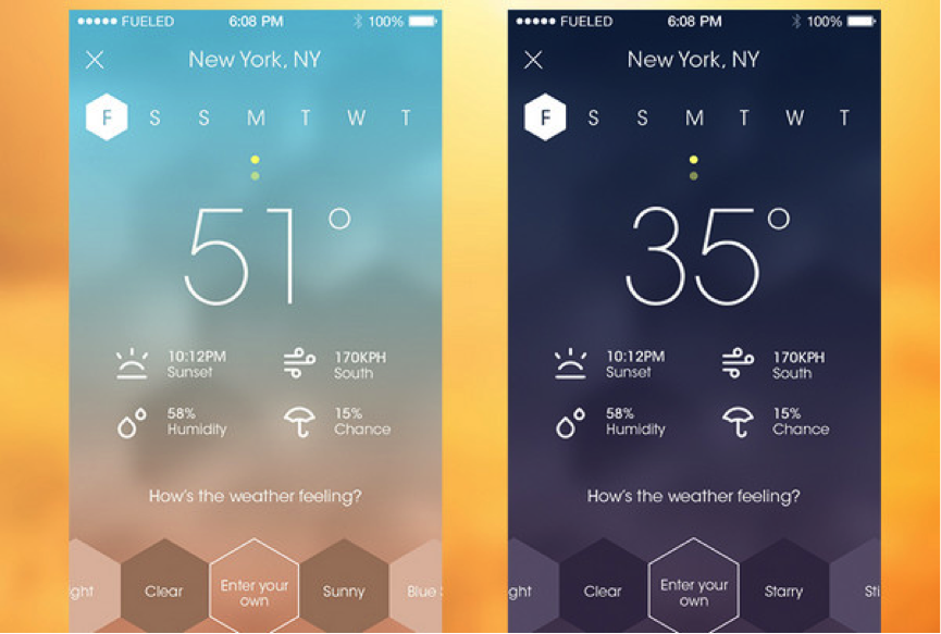 天氣應(yīng)用!由 Fueled設(shè)計(jì)的,經(jīng)過反復(fù)推敲,無不散發(fā)著精致和匠心的應(yīng)用界面。它有2個(gè)設(shè)計(jì)上的創(chuàng)新:利用模糊背景進(jìn)行巧妙、有效地內(nèi)容詮釋,超窄型字體與輪廓圖形設(shè)計(jì)的非常匹配。