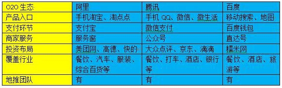 綜上所述,BAT在O2O領(lǐng)域布局的共同邏輯都是基于海量移動(dòng)用戶,以各自核心產(chǎn)品為基點(diǎn),建立起不同的生活使用場景,形成從一個(gè)完整的O2O生態(tài)系統(tǒng)。不同的是,有人占據(jù)地利,卻未必?fù)碛腥撕?,BAT三巨頭在O2O領(lǐng)域至今沒有更大的建樹。
