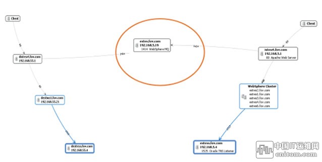 這里是一個實際的案例,展示的是同一個業(yè)務(wù)應(yīng)用的兩幅業(yè)務(wù)邏輯圖,它們是由VNT的IlluminIT系統(tǒng)自動發(fā)現(xiàn)的。上面的一幅是災(zāi)備系統(tǒng)里的環(huán)境,下面的一幅是生產(chǎn)系統(tǒng)的環(huán)境。