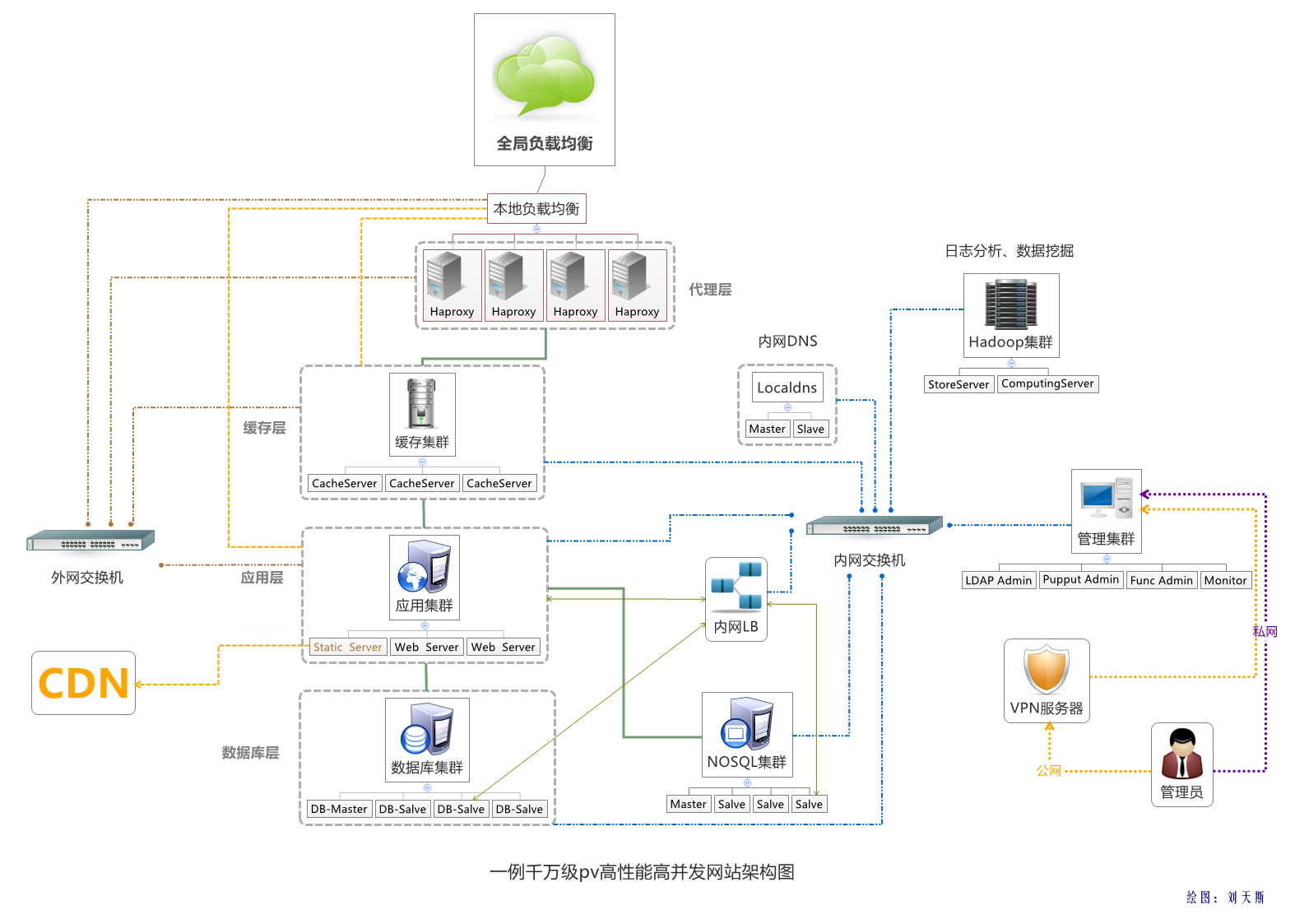 一個(gè)支撐千萬(wàn)級(jí)PV的網(wǎng)站是非??简?yàn)一個(gè)架構(gòu)是否成熟、健壯(本文不涉及軟件架構(gòu)的層面,有興趣也可以討論)?,F(xiàn)拋出一個(gè)系統(tǒng)層面的架構(gòu),不保證是最優(yōu)的方案,但也許適合你。理由是再優(yōu)秀的架構(gòu)都不具備通用性,需要根據(jù)每種應(yīng)用特點(diǎn)針對(duì)性來(lái)設(shè)計(jì)。