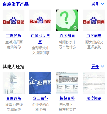 除了百度產(chǎn)品,下面還有兩個被推薦的欄目如,其他人還搜,相關(guān)網(wǎng)站。其實其他人還在搜站長都知道這是百度機(jī)器推薦的,根本不是網(wǎng)友搜索出來的,而我們需要做的能讓我們自己的詞條在網(wǎng)友搜索任何關(guān)于互聯(lián)網(wǎng)的關(guān)鍵詞都能出現(xiàn)我們的詞條在右邊的推薦欄里面。