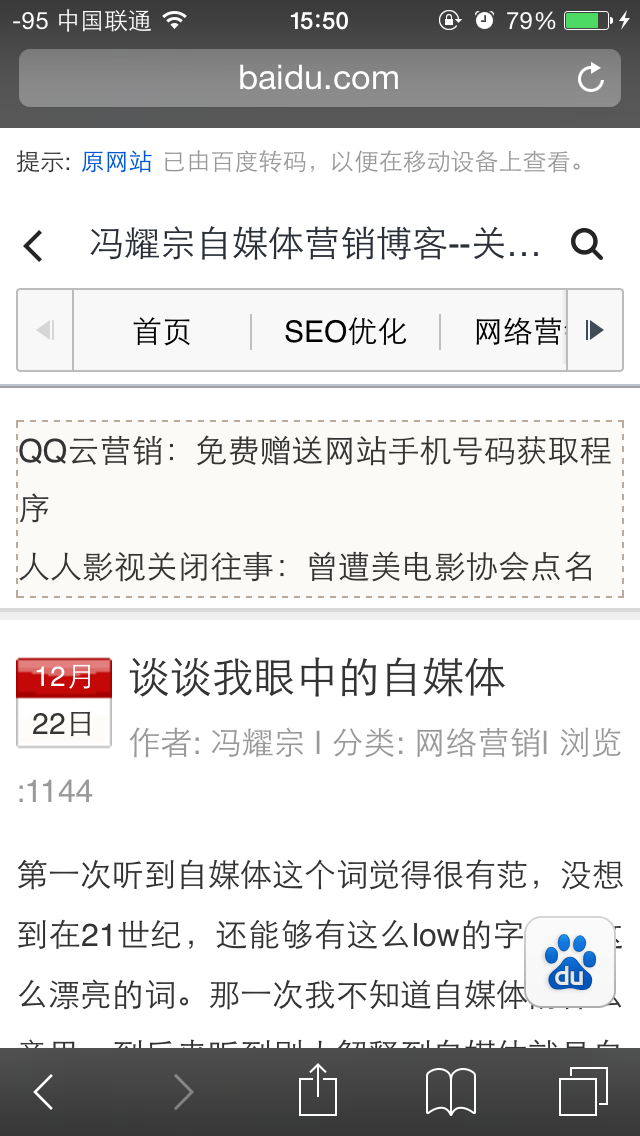 今天用手機搜索了我的網(wǎng)站進去以后發(fā)現(xiàn)網(wǎng)站由百度轉(zhuǎn)碼成手機站,納悶了我的手機站做的好好的為何轉(zhuǎn)成了百度的手機站?回想一下百度官方的移動網(wǎng)站建設(shè)常見問題集錦,我誤以為是百度機器無法識別響應(yīng)式站點,我在搜索了其他網(wǎng)站,發(fā)現(xiàn)出現(xiàn)這樣的情況還不少,而且他們都有自己的手機站卻轉(zhuǎn)成了百度的站!