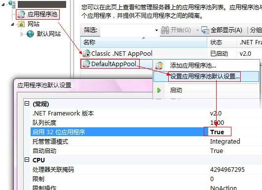 方法一:“設(shè)置應(yīng)用程序池默認屬性”/“常規(guī)”/”啟用32位應(yīng)用程序”,設(shè)置為 true。 如下圖所示: