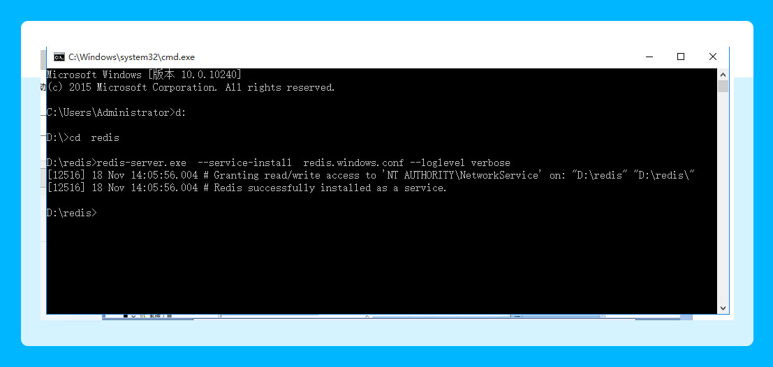 打開(kāi)windows操作命令行,進(jìn)入redis目錄并啟動(dòng)redis-server