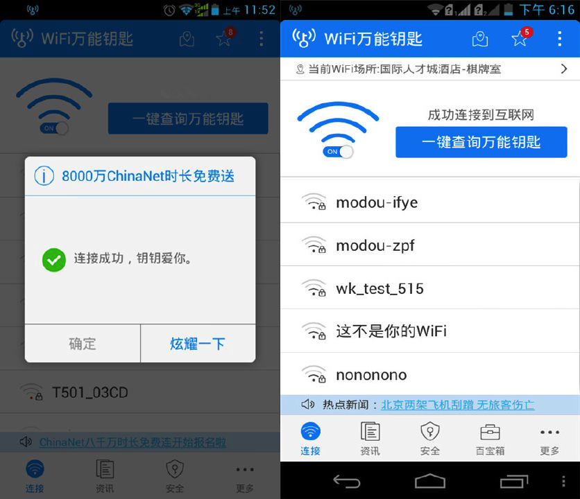 根據(jù)官方公布的數(shù)據(jù),WiFi 萬(wàn)能鑰匙 App 的總下載量超過(guò) 5 億,月活躍用戶高達(dá) 2.3 億,每天有超過(guò) 17 億次的連接網(wǎng)絡(luò)行為,已經(jīng)成為許多人外出連接 WiFi 的首選軟件。
