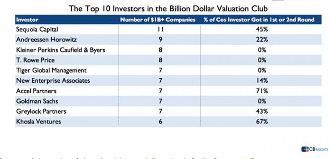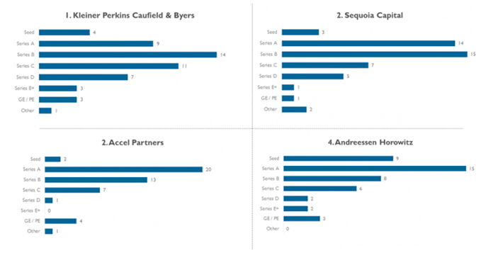 根據(jù)風(fēng)投公司所投資的具有上市潛力的創(chuàng)業(yè)公司數(shù)量——CBInsights把公司的估值作為是否具有上市潛力的衡量標(biāo)準(zhǔn)——排在前三位的風(fēng)投公司分別是KPCB風(fēng)投公司(Kleiner Perkins Caufield & Byers),紅杉資本(Sequoia Capital)和Accel Partners。但是這三家風(fēng)投公司各有側(cè)重點:KPCB風(fēng)投公司習(xí)慣在中間階段開始投資,而Andreessen Horowitz的投資集中在種子投資和A輪投資。紅杉資本和Accel Partners則更多地參與創(chuàng)業(yè)公司的A輪投資。